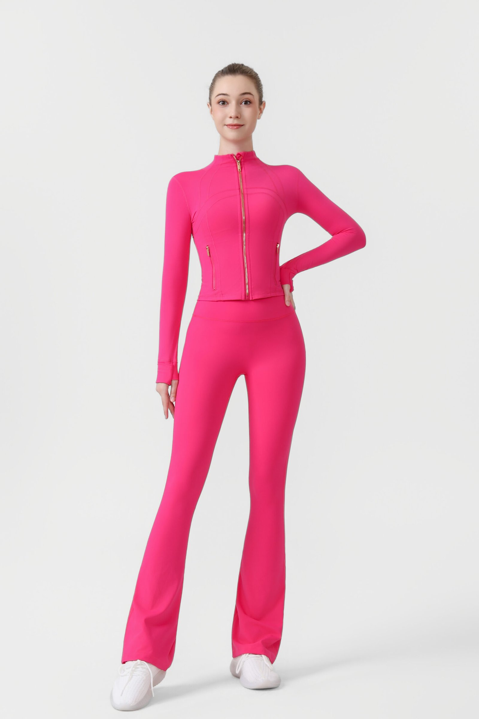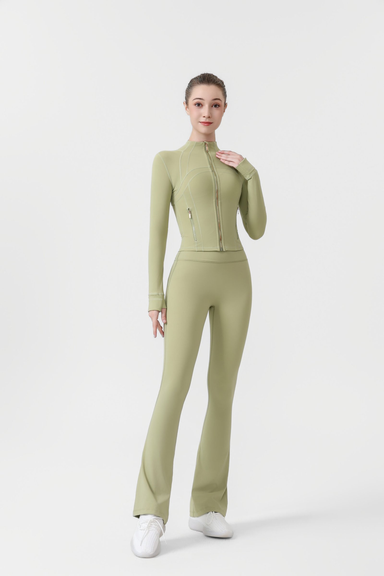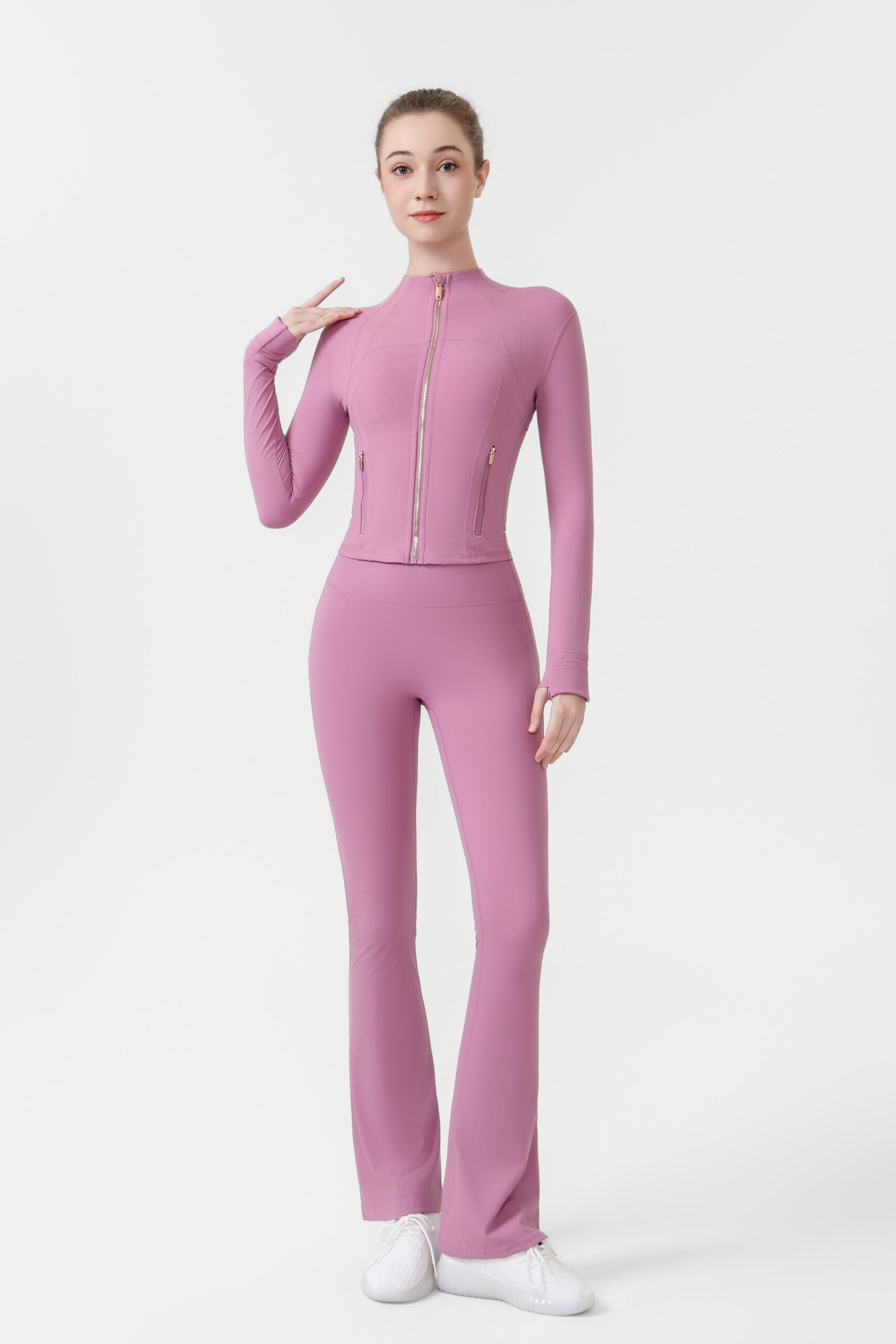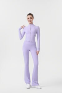 2.Gold zip-up short jacket and flared pants two-piece set, women’s yoga wear, sportswear set, stretchy and breathable yoga running and fitness wear.2