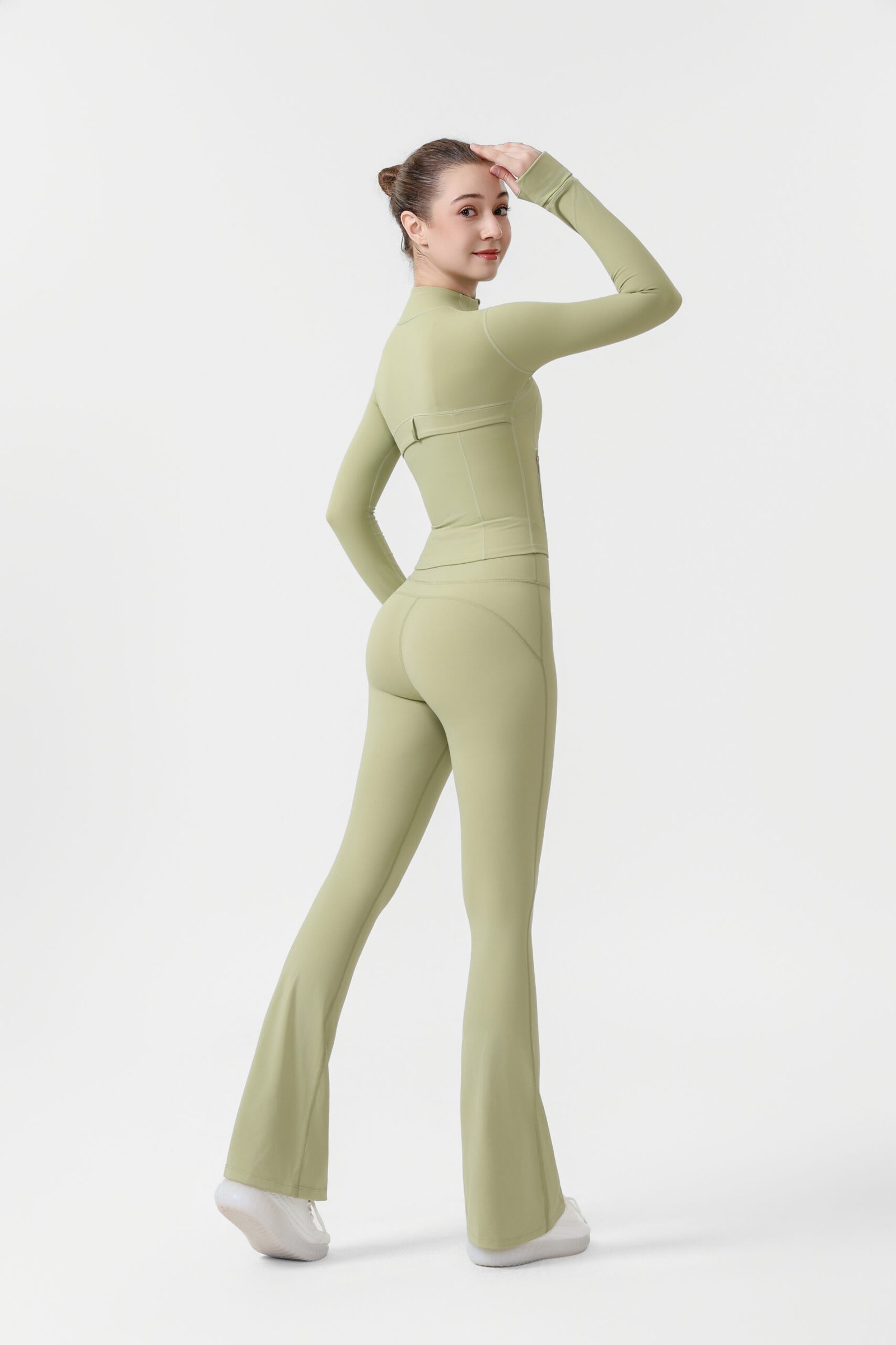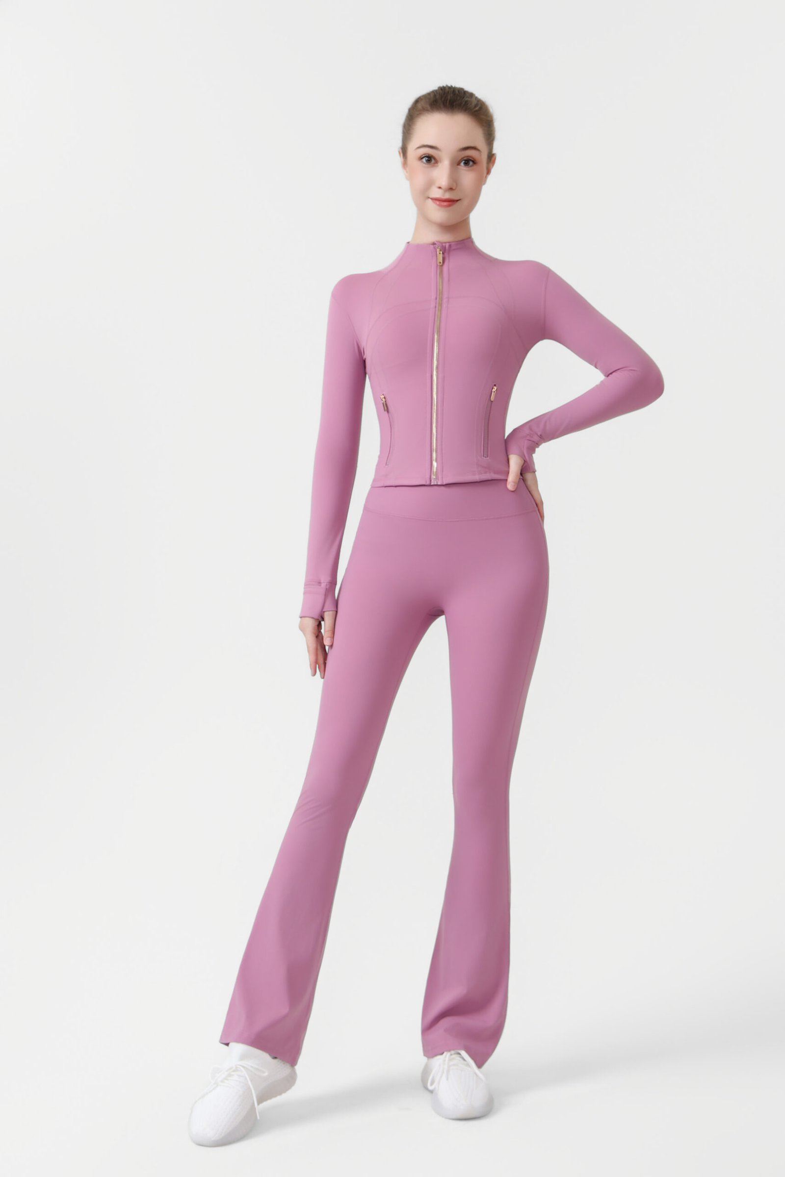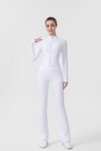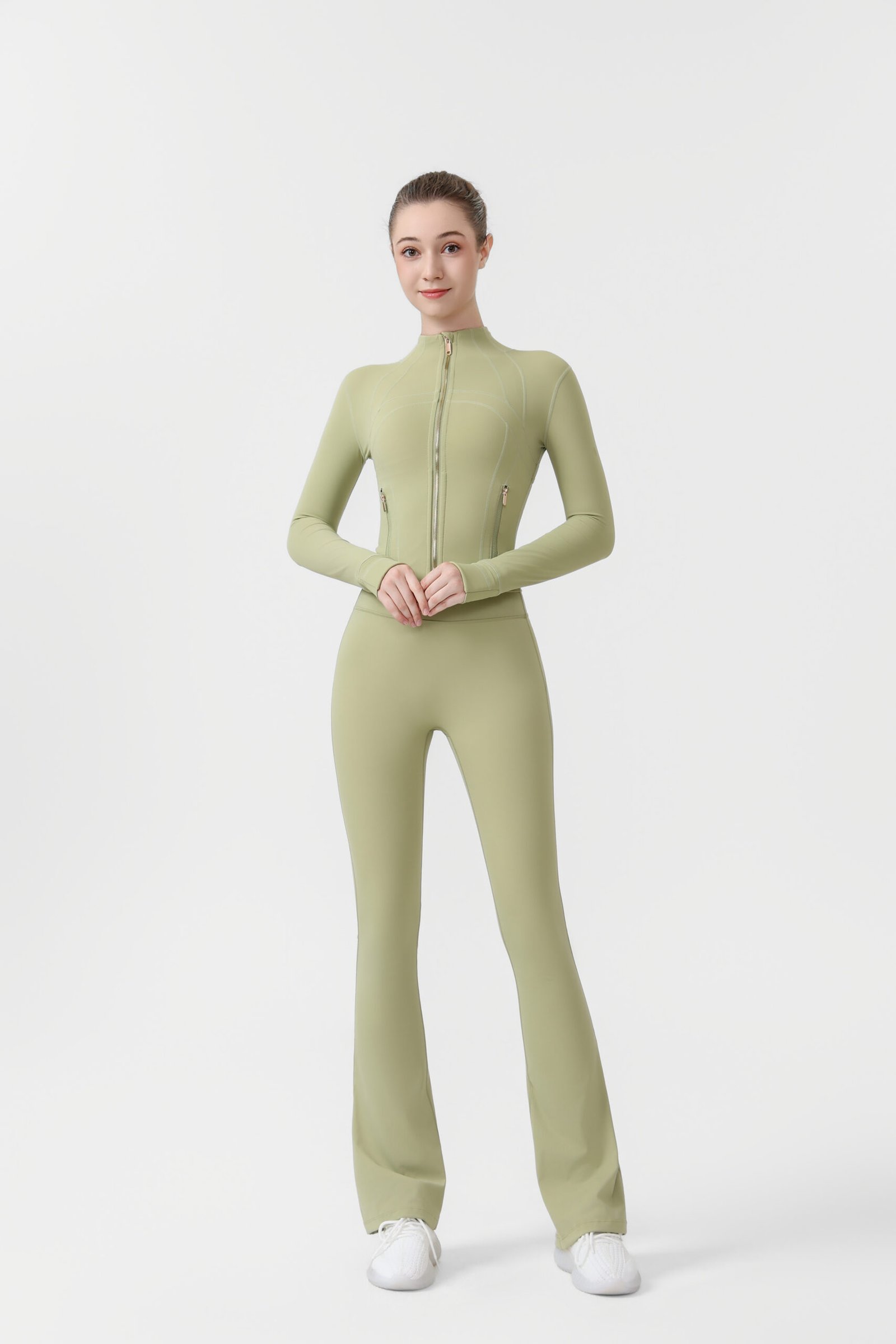 2.Gold zip-up short jacket and flared pants two-piece set, women’s yoga wear, sportswear set, stretchy and breathable yoga running and fitness wear.2