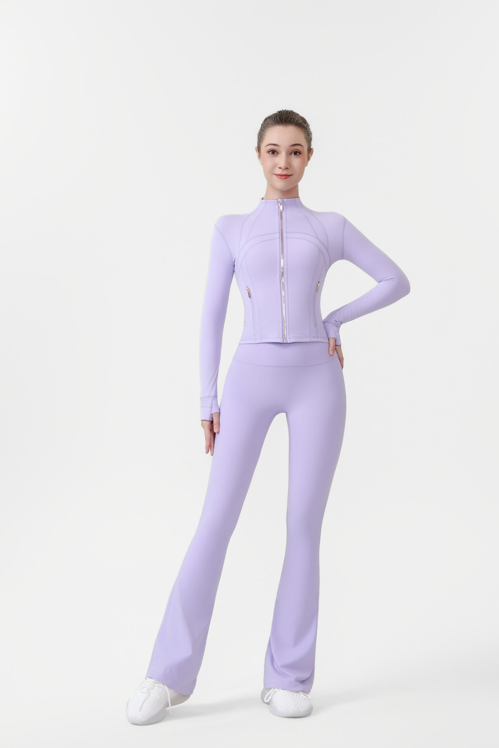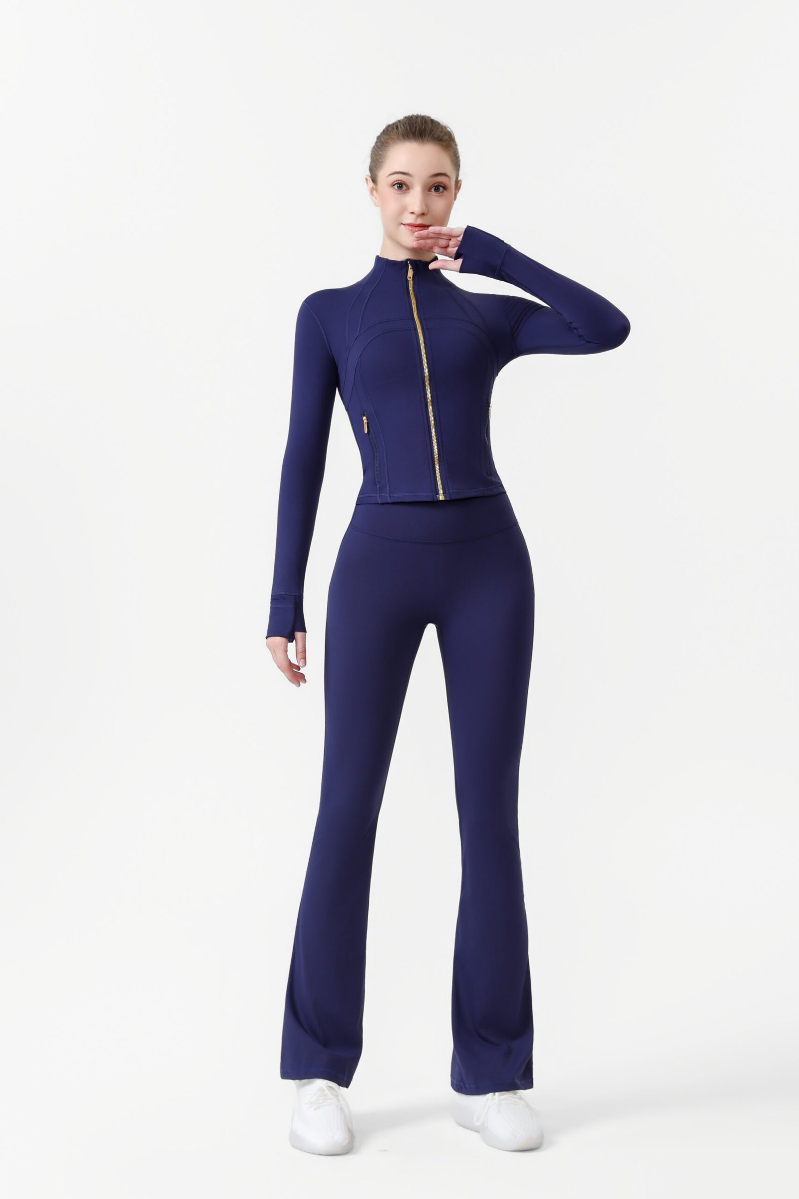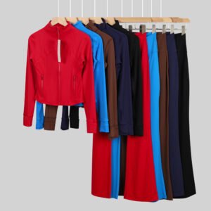 成为第一个“2.Gold zip-up short jacket and flared pants two-piece set, women’s yoga wear, sportswear set, stretchy and breathable yoga running and fitness wear.2” 的评价者